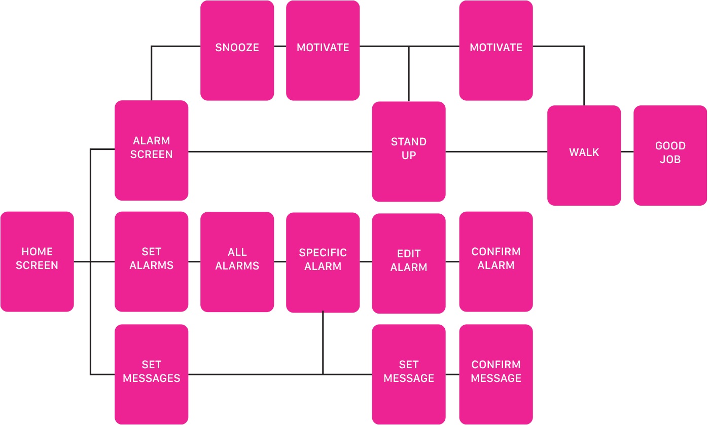When the user’s alarm goes off in the morning, they are prompted to stand for one minute, followed by walking around for five minutes. At any point in this process, the user can choose to “snooze” these prompts, to which they will then receive periodic buzzes on their wrist and a motivational message to help them complete the task. Users can also set times and messages for future alarms. Messages can be programmed on GTFU’s companion app on the user’s mobile device.
